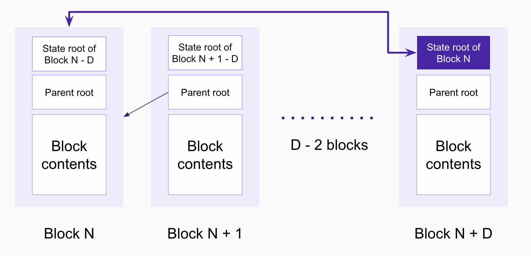 1. After the network comes to consensus (2/3 majority vote) on block N (typically upon receiving block N+2, which contains a QC-on-QC for block N), it means that the network has agreed that the official consequence of block N-D is a state rooted in merkle root M. Light clients can then query full nodes for merkle proofs of state variable values at block N-D.